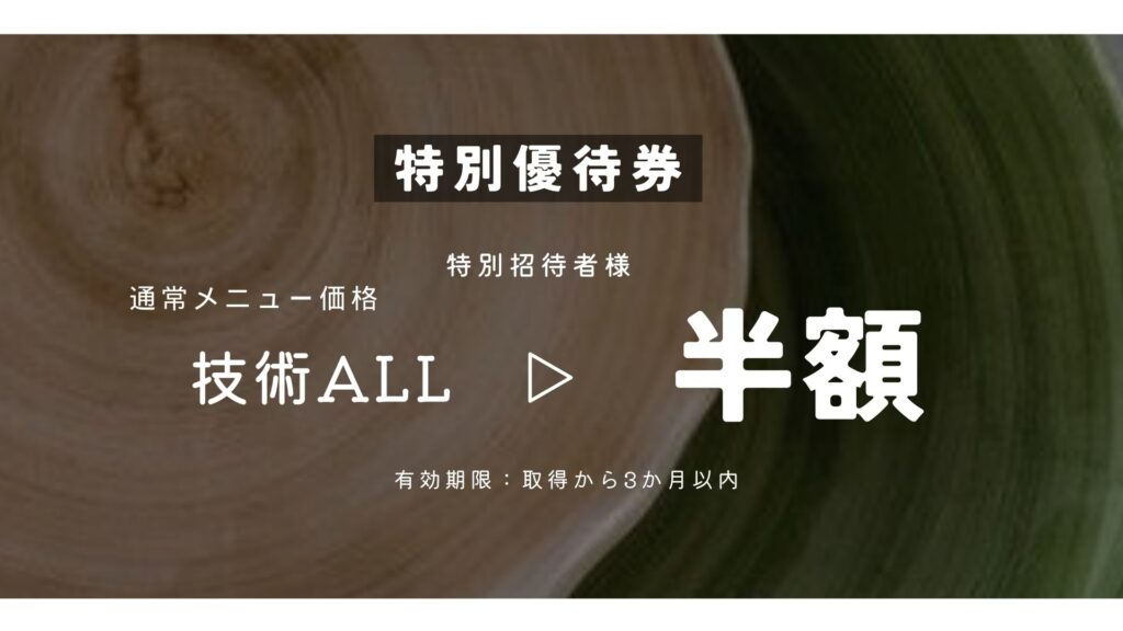 ※初回来店時に限る・被紹介者様⇒チケットご利用で初回技術半額・ご家族・ご友人がご来店された後、紹介者様に20%オフクーポン贈呈????・対象:全てのお客様・期間:-6月末